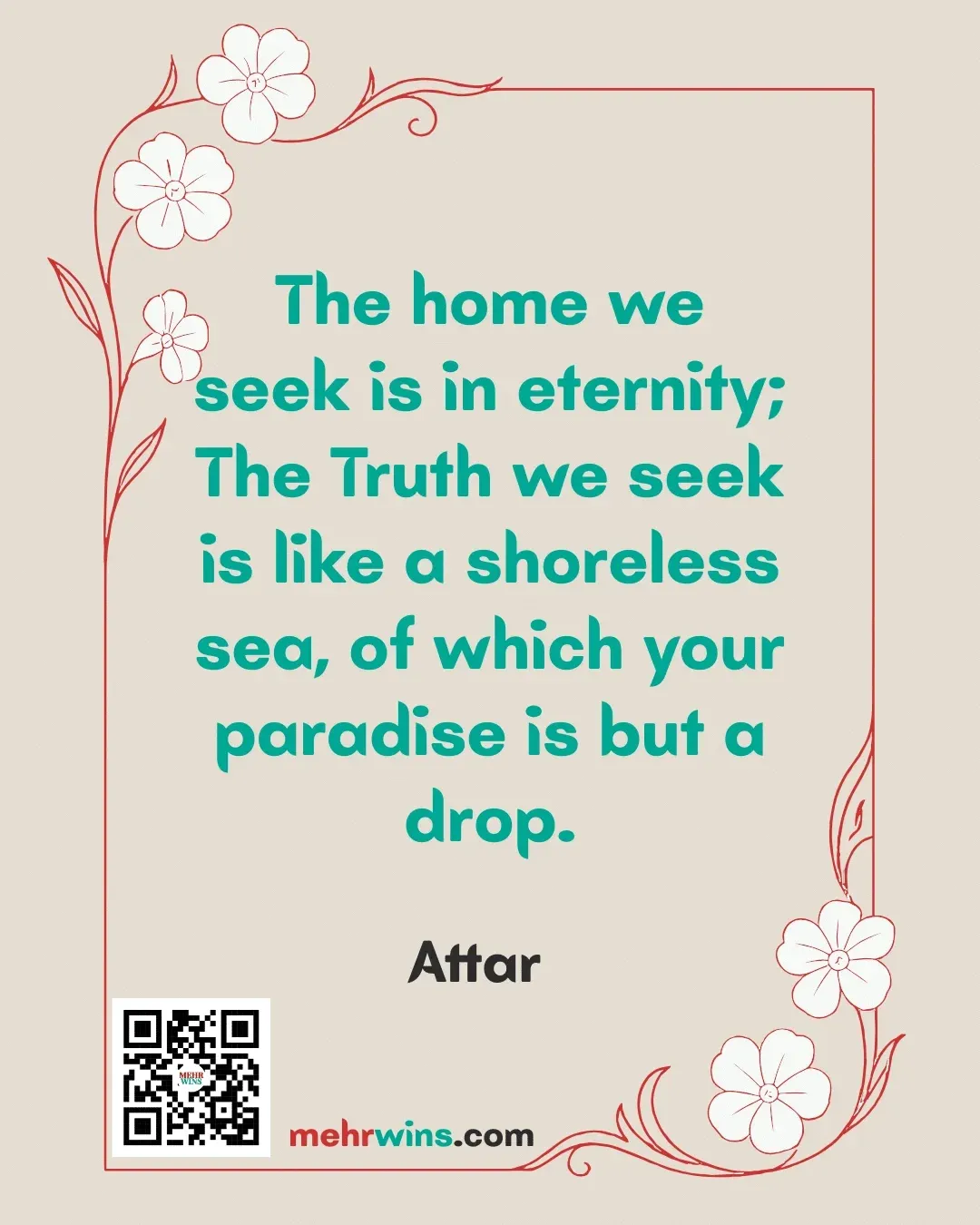 Read more: Attar: The Home We SeekQuote: “The home we seek is in eternity; The Truth we seek is like a shoreless sea, of which your paradise is but a drop.” – Attar