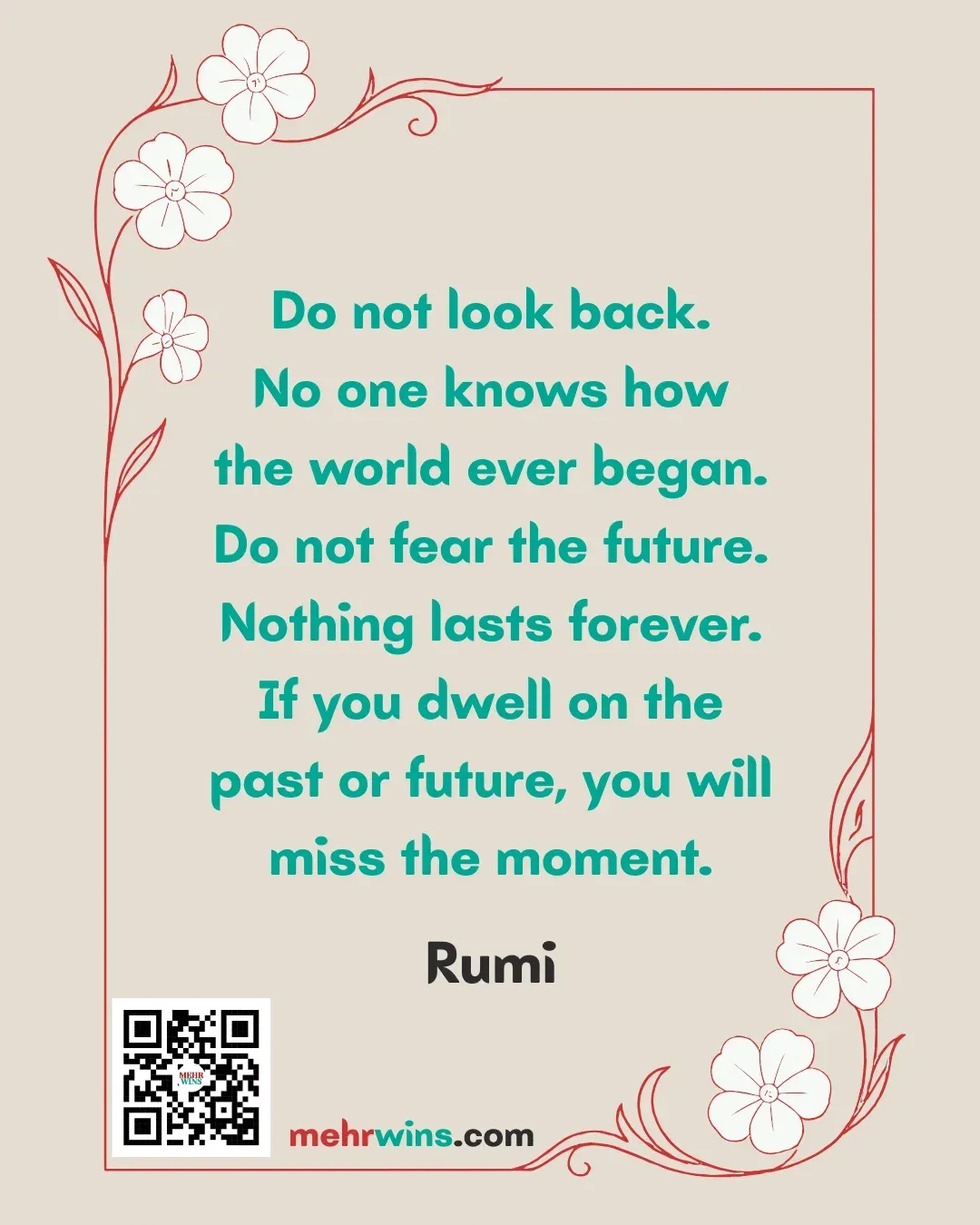 Read more: Rumi: Do Not Look BackQuote: “Do not look back. No one knows how the world ever began. Do not fear the future. Nothing lasts forever. If you dwell on the past or future, you will miss the moment.” – Rumi